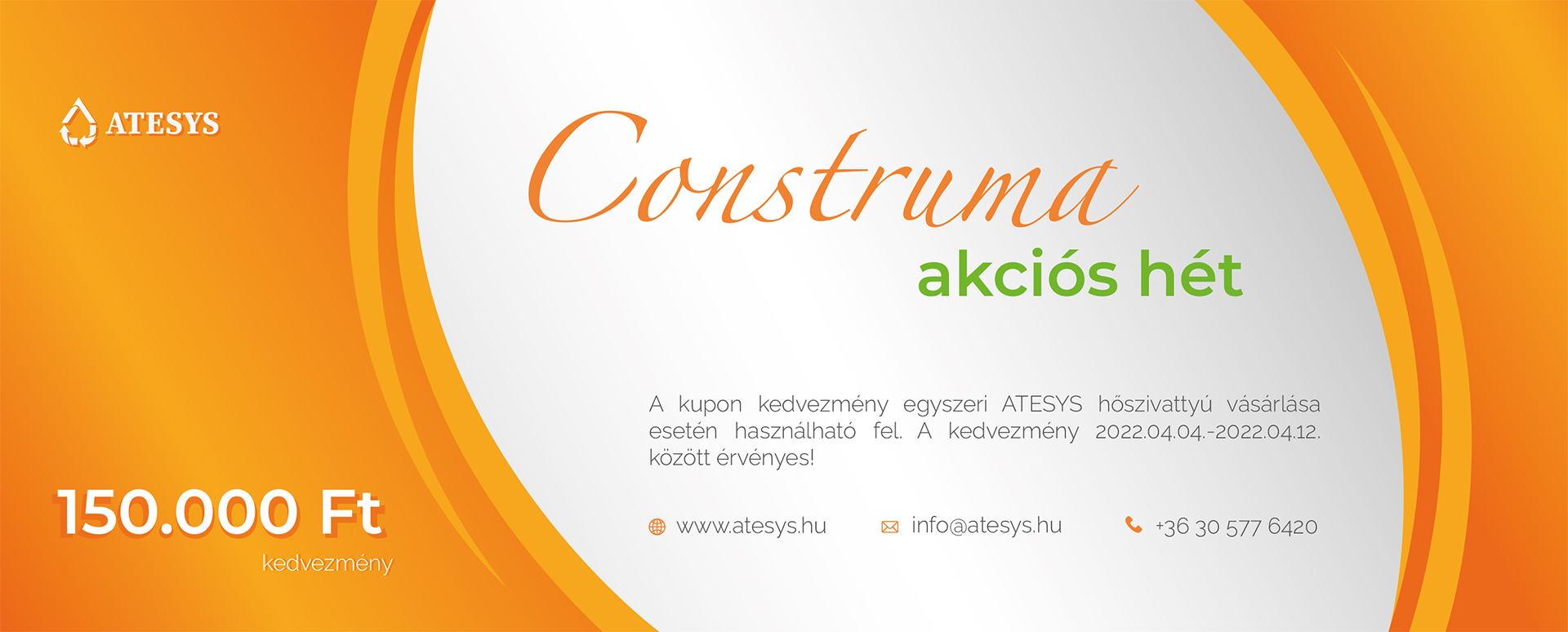 Azoknak az ügyfeleinknek akik a 40. Construma Nemzetközi építőipari szakkiállítás ideje alatt azaz 04.04-04.12 között vásárolnak tőlünk hőszivattyút, 150.000 forintos kupont ajándékozunk!